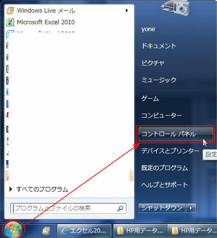 - 「スタート」から「コントロールパネル」をクリックします。