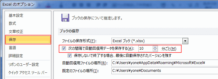 よねさんのExcelとWordの使い方|エクセル2010基本講座:目次|ブックの操作とブックの共有|自動回復用のファイル保存間隔を変更したい