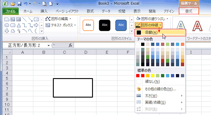 - 「描画ツール」リボンの[書式]タブで[図形の枠線]→「黒 自動」に変更します。