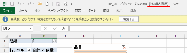 - タイトルバーのファイル名(ブック名)の後ろに[読み取り専用]と表示されます。