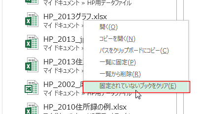 - 最近使ったブックの一覧ををクリアするには「固定されていないブックをクリア」を実行します。