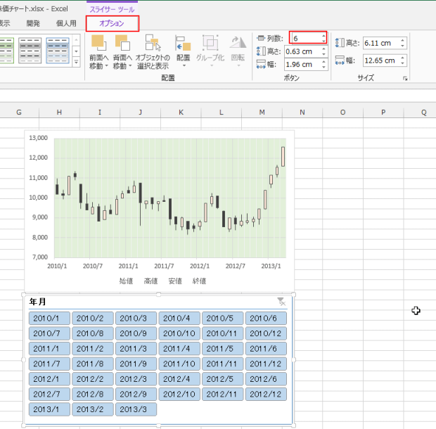 スライサー ツールのオプションタブで列数を「6」にして、スライサーのサイズも合わせて変更しました。