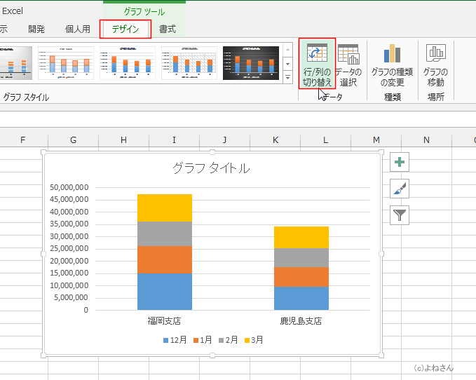 - グラフツールの[デザイン]タブを選択し、[行/列の切り替え]を実行すると項目軸に使用する列と行が切り替えられます。
