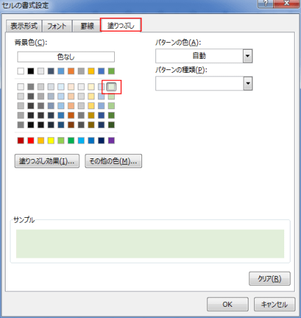 - [塗りつぶし]タブを選択して、背景色で「薄緑」を選択しました。
