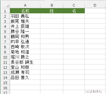 - 下図のような氏名が入力されたリストがあります。(姓と名がスペースで区切られています。)