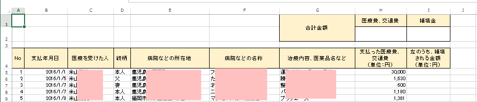 医療を受けた人、病院や薬局の所在地と名称、医療費の内訳、生命保険や健康保険で補てんされる金額で1行となっています。