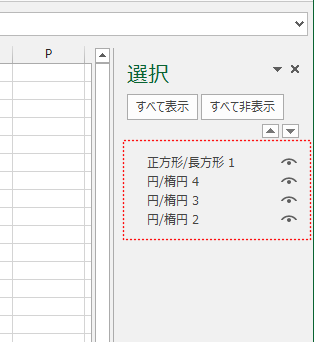 - 複数の図形を選択したいときは、選択ウィンドウで[Ctrl]キーを押した状態でオブジェクト名をクリックして選択します。