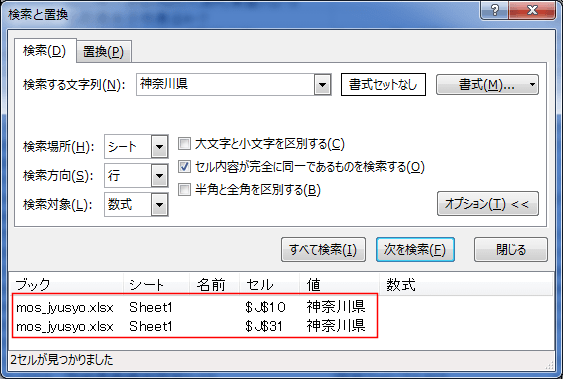 - 「神奈川県」と完全に一致するセル2個が検索できました。