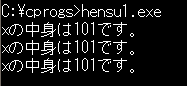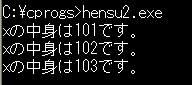 上の実行例を見て、関数内で定義したstaticな変数の振る舞いを理解してください。xは、一度だけ定義され、そのときに100という値を与えられます。その後、shgowxを実行するたびに、1増やされて表示されるので、Fig.5のような実行画面になるのです。