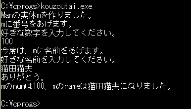 これで、Manという構造体(「設計図」)の「実体」ができ、それがmで表されることになるのです。このとき、mの中には、numとnameがあり、それぞれm.num、m.nameと表されます。たとえば、あまり意味はありませんが、次のようなプログラムが書けます。