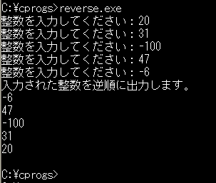 たとえば、ユーザに整数を5個入力してもらい、それを逆順に出力するプログラムを書いてみましょう。