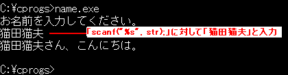 しかし、初心者に、この説明だけではわかりにくいと思います。より詳しくは、次回に説明します。今重要なことは、「scanf("%s",