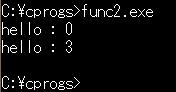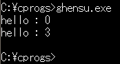 mainの中では、2回helloを呼び出し(つまり、実行し)ています。最初の呼び出し時には、xの値が0ですが、そのあとで3にしているので、2度目の呼び出し時にxは3になっているわけです。表示もそのようになっていますね。