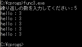func3.cでは、後ろの引数(繰り返しの数)をユーザに入力してもらうようにしました(Fig.5では、「5」と入力していますね)が、もちろん、