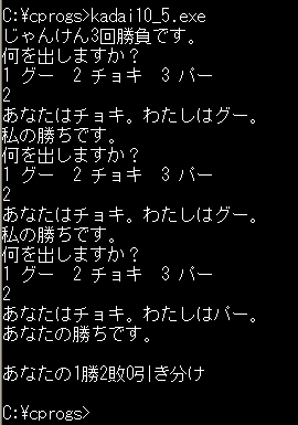 4. ユーザとじゃんけんをして、ひきわけなら0、ユーザが勝ったら1、コンピュータが勝ったら2を