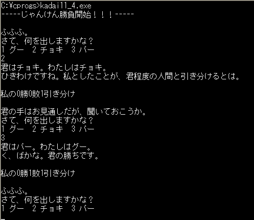else if(cwin < uwin) printf("君が勝つとは...。\nく、くやしい。\n");