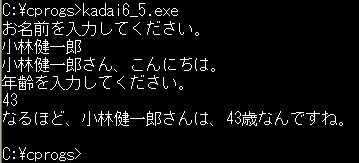 5. ユーザに名前を聞き、その人に年齢を聞き、あいさつするプログラムを書いてください。