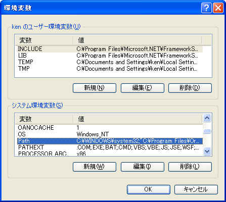 このダイアログの下の欄で[Path]を選び、下の[編集]のボタンを押し、[システムの編集]ダイアログを開きます。
