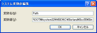 ここで、すでに書いてある変数値を消さないように注意して、その最後に「;C:\Borland\Bcc55\Bin」を付け加え、[OK]ボタンを押し終了します。上の画像に見えている「ROOT〜WBEM」はあくまで私の環境のものであって、みなさんのものとは異なるはずです。みなさんの環境では、単に、「;C:\Borland\Bcc55\Bin」を付け加えるだけにして、他の部分は変更しないようにしてください。