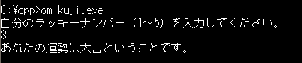 x = rand() % 5 + 1; //1〜5の乱数を発生させ、xに代入、これが引いたおみくじの番号