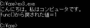 少し見慣れない形式ですね。上のプログラムでは、まず関数func()を定義しているのです。関数と言ってもただ「こんにちは。私はコンピュータです。」と画面に表示するだけの関数です。このようにクラスとは何の関係もない関数を定義することもできるのです。このような関数を一般に、グローバル関数などといいます。