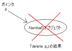 などという格好にします。これによってオブジェクトが生成され、そのアドレスがポインタに代入されるのです。newはそのように作られているのです。「pにオブジェクトのアドレスが格納される」ということは、「pがそのオブジェクトを指し示している」ということです。