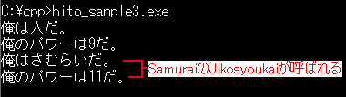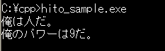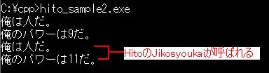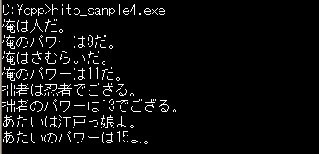 なお、あとで利用するため、Hitoには、powerの値を設定するset_powerと、powerの値を戻すget_powerという関数を付けてありますが、ここでは利用していません。