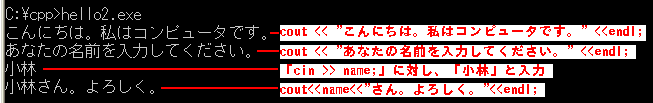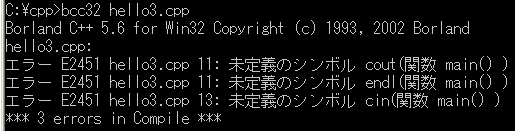 まず、「#include <iostream>」や「#include <string>」の意味です。簡単に言うと、「#include」は、「必要なものを持って来い」(インクルードするといいます)という程度の意味です。そして、<iostream>には、入出力に必要な「情報」が入っているのです。たとえば、cout、cin、endlというものの「名前」が、<iostream>に入っているのです。そのため、それらは「#include <iostream>」と書くことで使えるようになるのです。ためしに、「#include <iostream>」を削除したhello3.cppをコンパイルすると、エラーになると思います。(コンパイラによっては、エラーにしないかもしれません。それは、たまたま「プログラマにあまい」コンパイラなのです。)たとえば、Borland