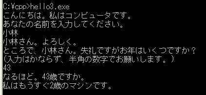 また、日本語(=全角)の数字は数として扱われません。数を入力するときは、(もう一度、日本語入力モードから半角入力モードに戻すなどして、)半角の数字で入力してください。そのことをユーザにわからせるため、年齢の入力の前に「cout