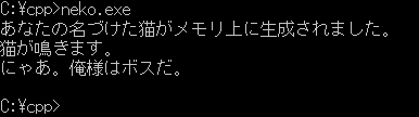 cout << "あなたの名づけた猫がメモリ上に生成されました。"