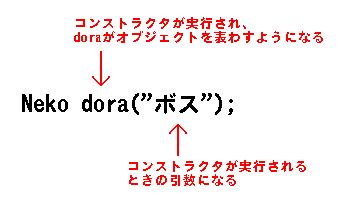 「Neko dora("ボス");」では、Nekoがクラス名、doraが変数で、「"ボス"」がコンストラクタに引数として渡されるのです。このコード以降は、doraがNekoオブジェクトを表わすことになります。)そういうものなのです。