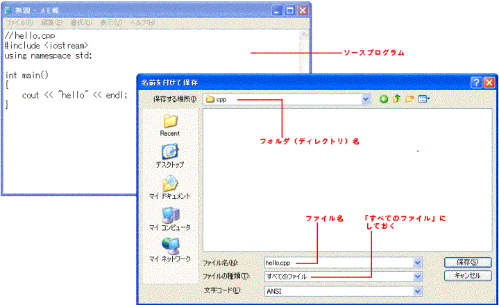また、保存するときには、ソースを置くフォルダを適当に決めます。私は、C:\cppというフォルダにソースを置くことにします。もちろん、別のフォルダを選んでもかまいません。いずれにしても、適当なフォルダを作って(あるいは選んで)、そこにhello.cppを保存します。名前が、hello.cpp.txtなどにならないように気をつけてください。