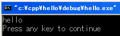 上の図の「hello」という出力が実行結果です。ここで何かキーを押すと、「実行」が終了します。