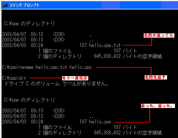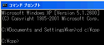 です。ただし、これは私の環境なので、みなさんのものは違うはずです。ここから、プログラムを置いたフォルダ(ディレクトリ)に移動します。私はC:\cppに置くことにしたので、そのフォルダ(ディレクトリ)には、
