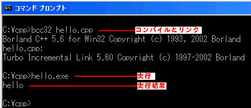 実際のコンパイルと実行の画面は下のようになります。(ここで、私のコンパイラは、バージョンが5.6ですが、無料版は、5.5だと思います。)