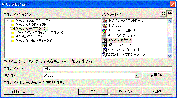 「プロジェクト名」は何でもかまいませんが、ここでは「hello」に、また、「場所」は「C:\cpp」にしました。また、上左横の「プロジェクトの種類」には、生成可能なプロジェクトの種類が表示されます(みなさんのものは違うかもしれません)。ここでは「Visual