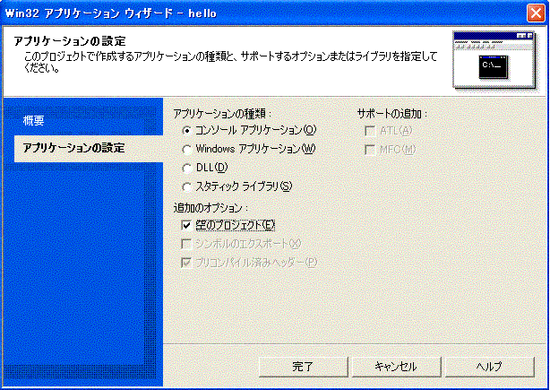そしてOKボタンを押します。すると、「アプリケーションウィザード」ダイアログが開きます。ここで、左の方で、「アプリケーションの設定」を選び、右では「コンソールアプリケーション」と「空のプロジェクト」を選びます。