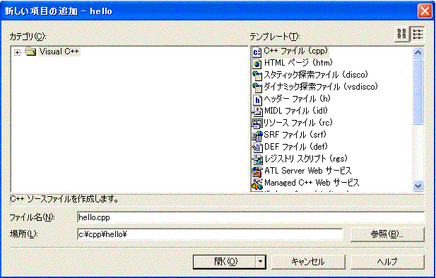 ここでは、上右横の「テンプレート」で「C++ファイル」を選び、ファイル名を「hello.cpp」(拡張子はなくてもかまいません)とします。