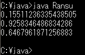このプログラムを実行すると、3つのでたらめな数(正確には、0以上1未満のでたらめな数)が出力されるのです。このようなでたらめな数を乱数といいます。上のプログラムで、Math.random()というのは、「乱数を発生させるメソッド」で、「書いてある場所に、乱数を置いてくれる」メソッドなのです。System.out.printlnの丸カッコの中に「乱数を置く」ので、それが出力されるわけです。当然、main()の中に「System.out.println(Math.random());」をいくつも書けば、それだけ乱数が表示されるのです。(正確に言うと、Math.randomは、Mathというクラスのrandomというメソッドということになります。詳しくは、後ほど。また、「置いてくれる」は業界用語ではありません。Javaの用語では、「乱数を返す」などと言います。このような言い回しはあとで説明しますので、とりあえずは、「置いてくれる」と考えておいてください。)