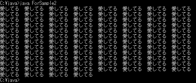 と書くことができます。以下では、このような書き方も使います。ループを実現するには、for文というものもあります。たとえば、WhileSample.javaと同じ動作をするプログラムを、for文を使って次のように書けます。