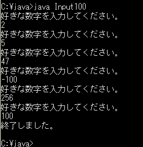 そして、無限ループであっても、そうではない普通のループであっても、ループの中で「break;」という命令を実行するとループからぬける(ループを終了する)ということになっています。これを使うとinput100.cppと同じ動作をするプログラムを次のように書くことができるのです。
