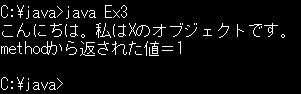 実際実行してみてください。まず、画面に「こんにちは。私はXのオブジェクトです。」と出力され、その後に(と言っても,人間の目にその順序は見えませんが)数値1が画面に出力されて終わりになります。