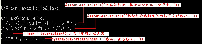 今日は、まず、「コンピュータが名前をきいて、それに答えると、コンピュータがあいさつする」というようなプログラムを考えてみましょう。もちろん、コンピュータは本当に質問したりしませんから、そのように見せかける必要があります。それは前回やったSystem.out.printlnでできそうです。