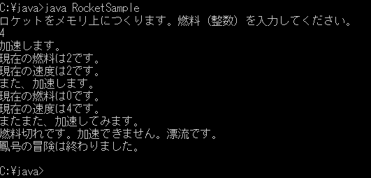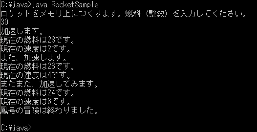 と読みます。つまり、ここでは「nenryoが2以上でなければ」という意味ですね。その場合は、燃料切れという意味ですから、ロケットは加速せず漂流としました。それがelseのブロックに書いてあることです。 それでは、このRocketクラスを使った、またまた簡単なプログラムを書いてみます。ここでは、Rocketを使うため、mainを持つクラスRocketSampleを作ることにします。