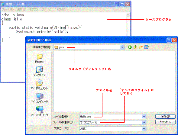 また、保存するときには、ソースを置くフォルダを適当に決めます。私は、C:\javaというフォルダにソースを置くことにします。もちろん、別のフォルダを選んでもかまいません。いずれにしても、適当なフォルダを作って(あるいは選んで)、そこにHello.javaを保存します。その際、名前が、Hello.java.txtなどにならないように気をつけてください。