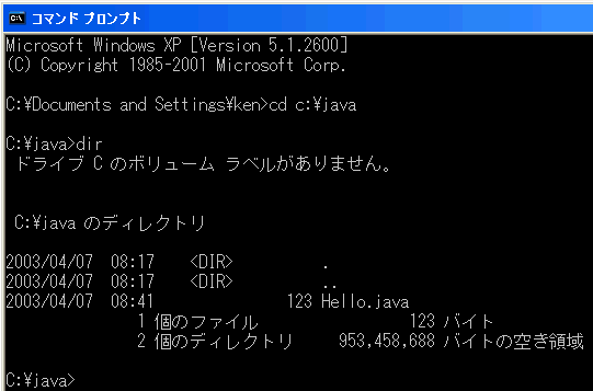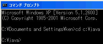 です。ただし、これは、私の環境なので、みなさんのものは違うはずです。ここから、プログラムを置いたフォルダ(ディレクトリ)に移動します。私はC:\javaに置くことにしたので、そのフォルダ(ディレクトリ)には、