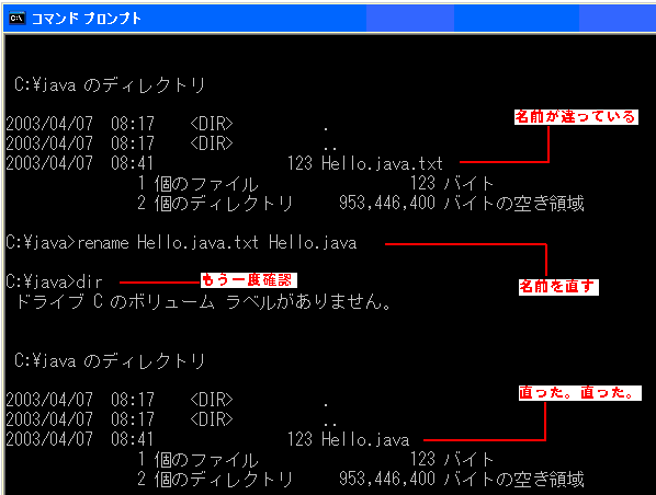 上の図では、Hello.javaが存在することが示されています。もし、ファイル名がHello.java.txtなどとなっていたら、