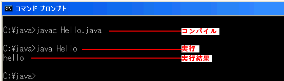 とすれば、コンパイルされ、クラスファイルができます。さらに、そのクラスファイルを実行するには、