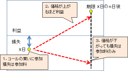 ある期限の時に、予想した価格よりも価格が上がっていた場合、価格から参加した費用を引いた額が利益になります。価格が上がれば上がるほど利益になります。