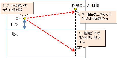 ある期限の時に、予想した価格よりも価格が上がっていた場合、価格から買い手の参加料を引いた額が損失になります。価格が上がれば上がるほど損失になります。
